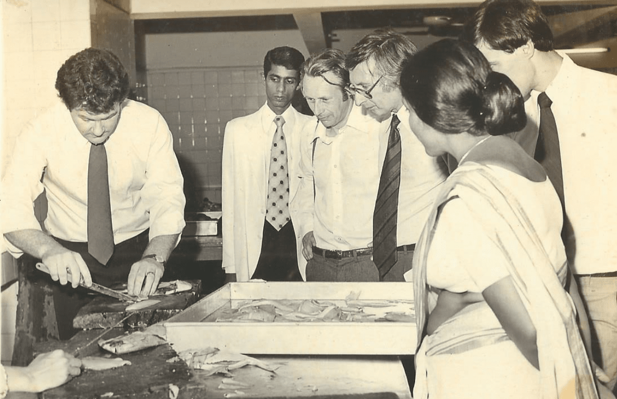 fish filleting demo being watched by Mr Simon and Dr Eapn on the extreme right