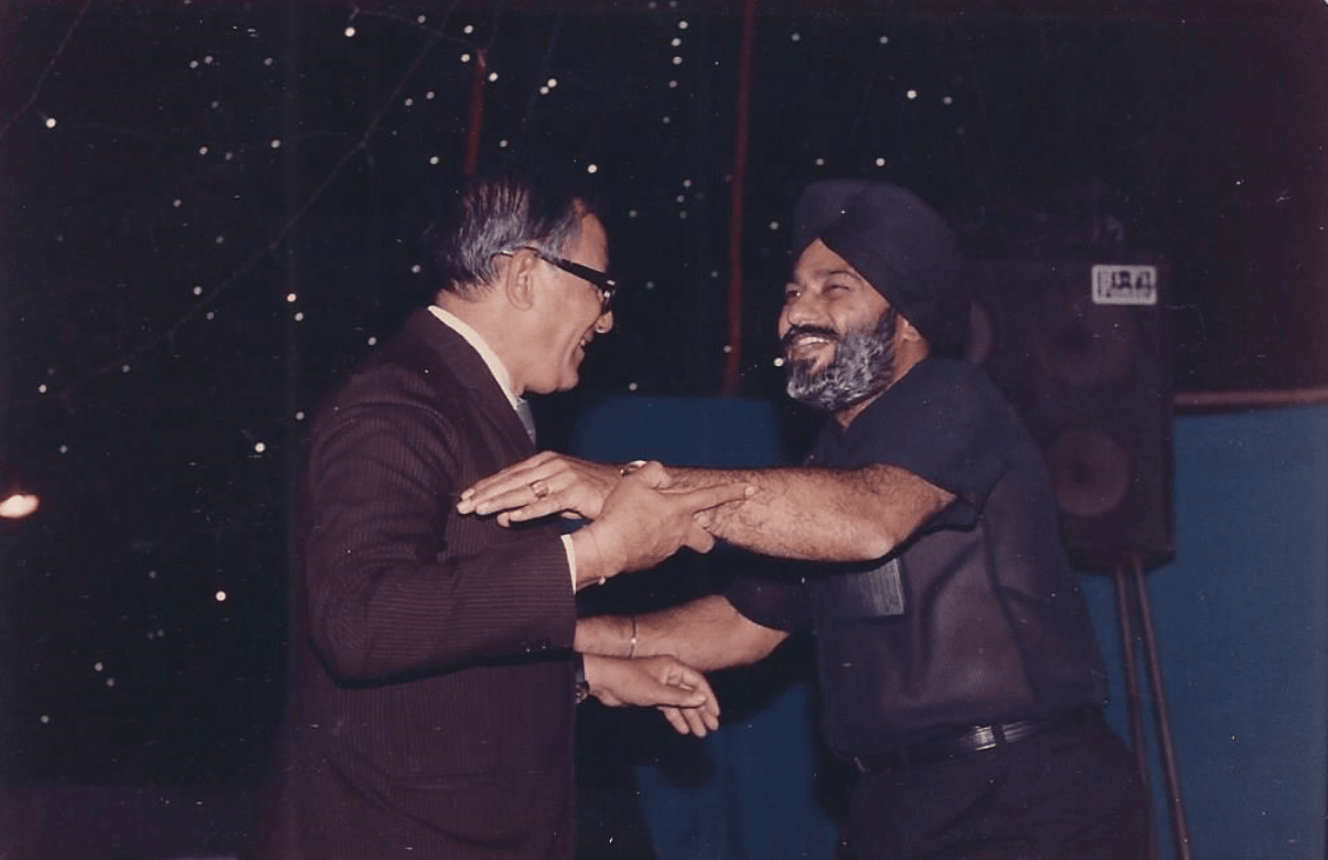 Mrs Shanta Deokule demonstrating Mr Shalia standing behind her
